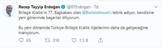 Cumhurbaşkanı Recep Tayyip Erdoğan: Birleşik Krallık’ın 77. Başbakanı olan Boris Johnson’ı tebrik ediyor, kendisine yeni görevinde başarılar diliyorum. Bu yeni dönemde Türkiye-Birleşik Krallık ilişkilerinin daha da gelişeceğine inanıyorum.